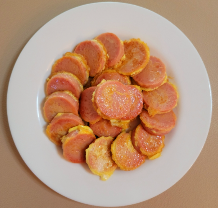 - 가장 대중적인 조리법으로, 분홍소시지를 얇게 썰어 밀가루와 계란물을 입혀 노릇하게 부친다.